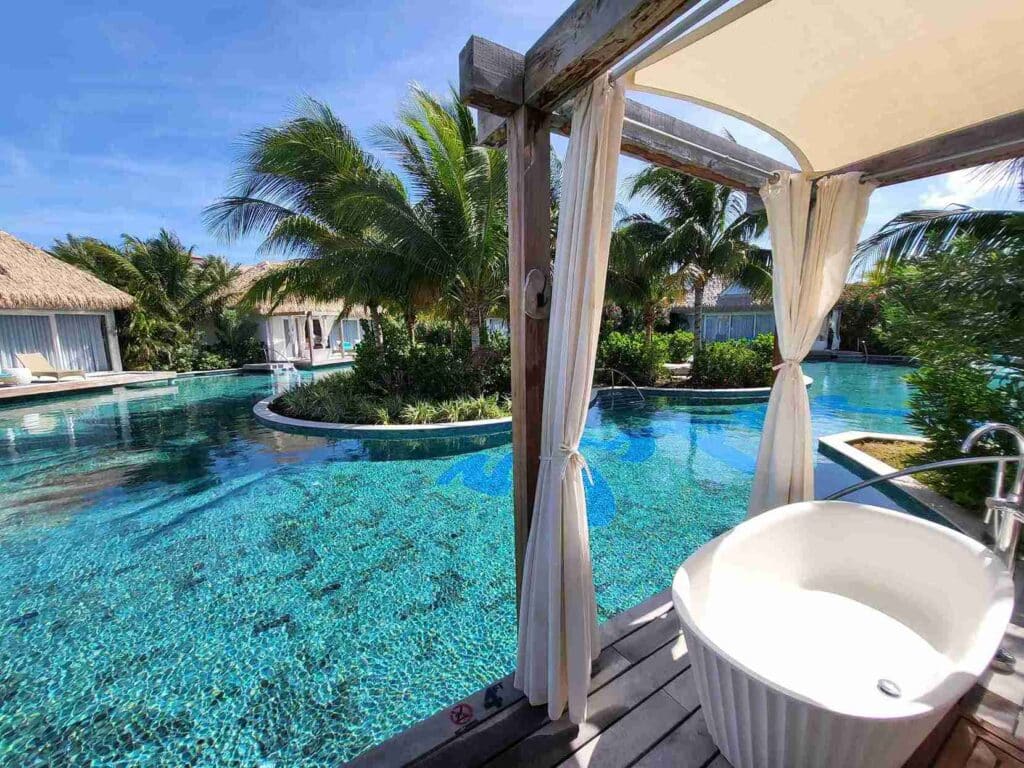 Set on a two-mile beach within a nature preserve, South Coast feels like its own world. The overwater bungalows and the overwater bar make the setting more dramatic at sunset than photos suggest. Rooms are spread along three European-themed villages, so even at high occupancy, you can find space.