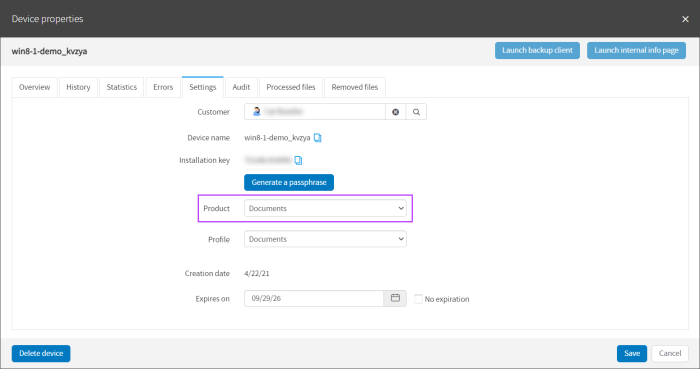 A standard Backup Manager device cannot be downgraded to Documents.
