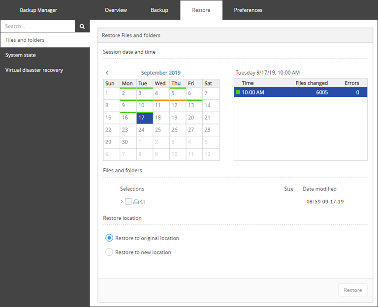 When the backup session is complete, the data becomes available for recovery. You can see a new entry in the calendar on the Restore tab.
