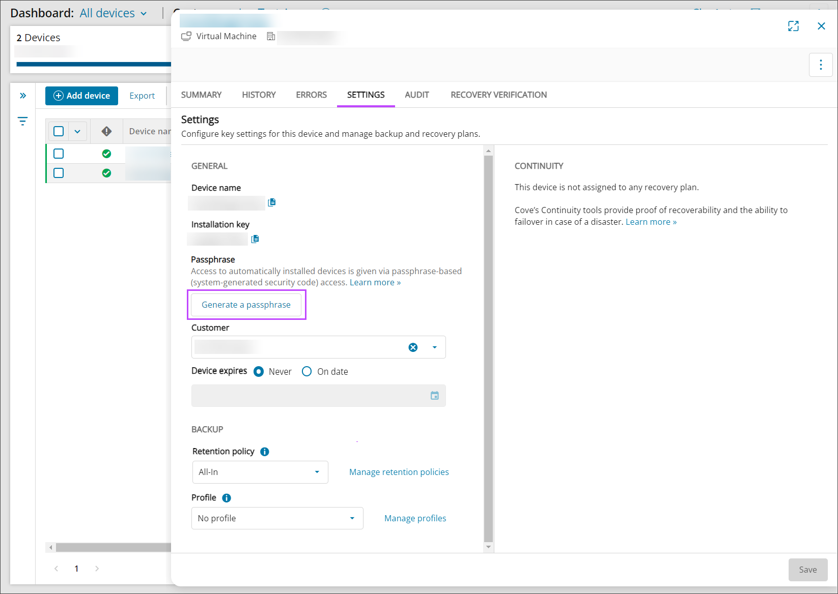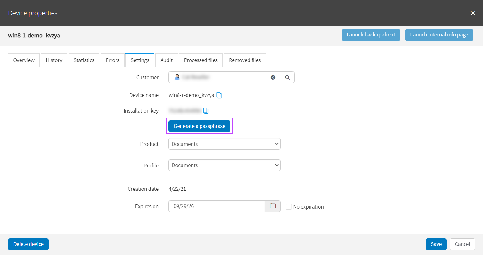 If you do not have the Generate passphrase option, go to User management and make sure you are logged in under the right user account and that the device was installed using Managed Installation.
