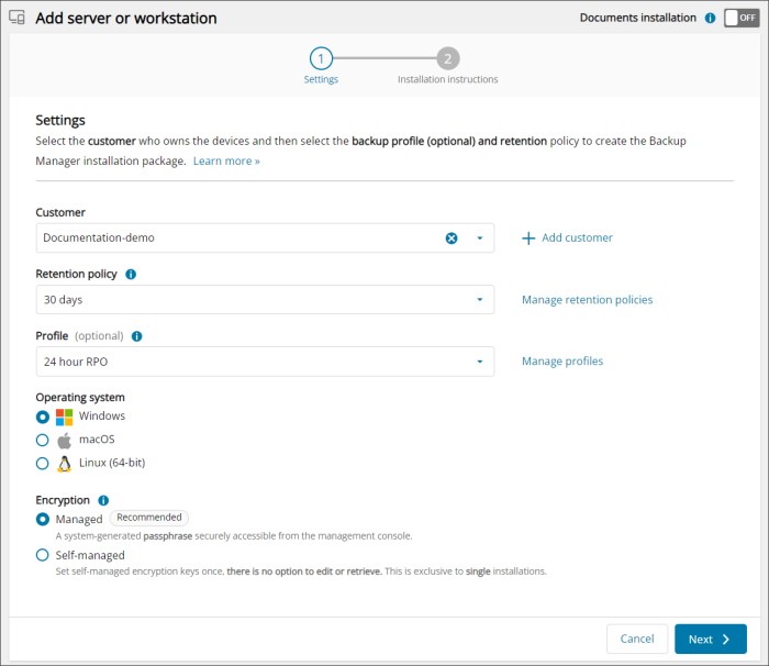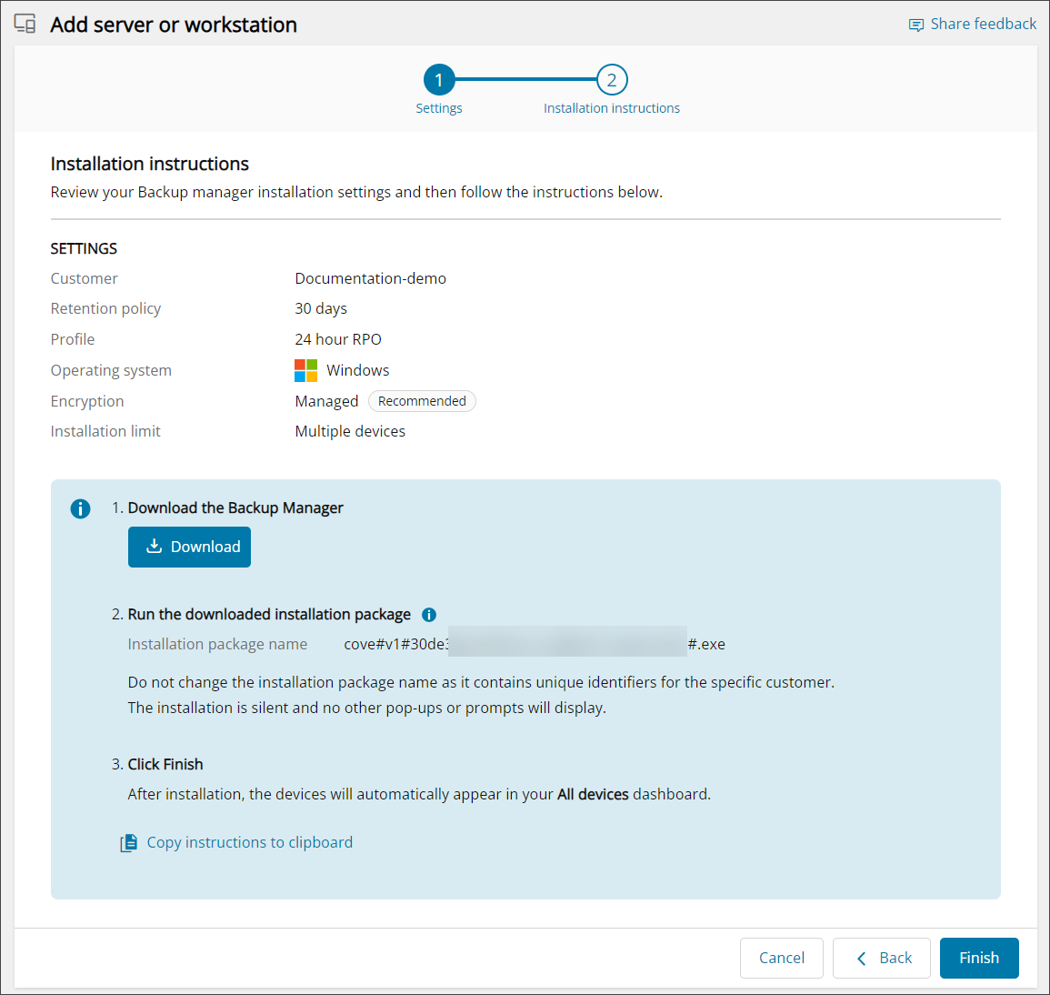 - Confirm the settings, then Download the Backup Manager installer for the device(s)