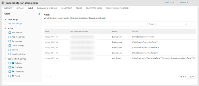In here you will be able to see which user account created the domain, added or removed services, amended backup selections, started restores and deleted backup history.