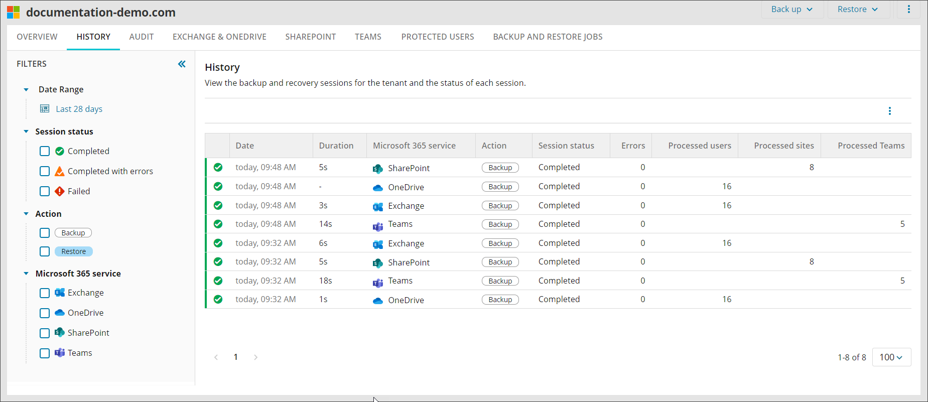 On the Protected users tab, you can view a full list of all users for whom at least one data source (service) is backed up, how many of these users are billable and the services protected for these users.