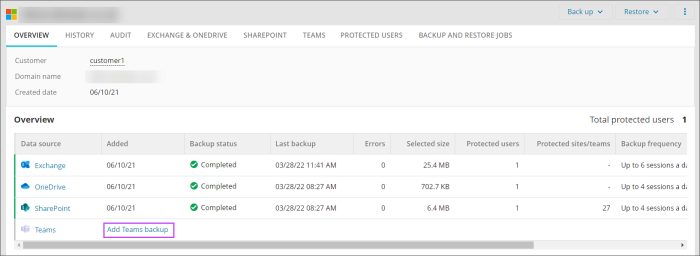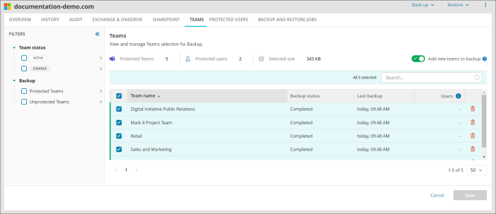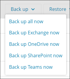 - Back up Teams now (initiates an unscheduled backup of Teams)