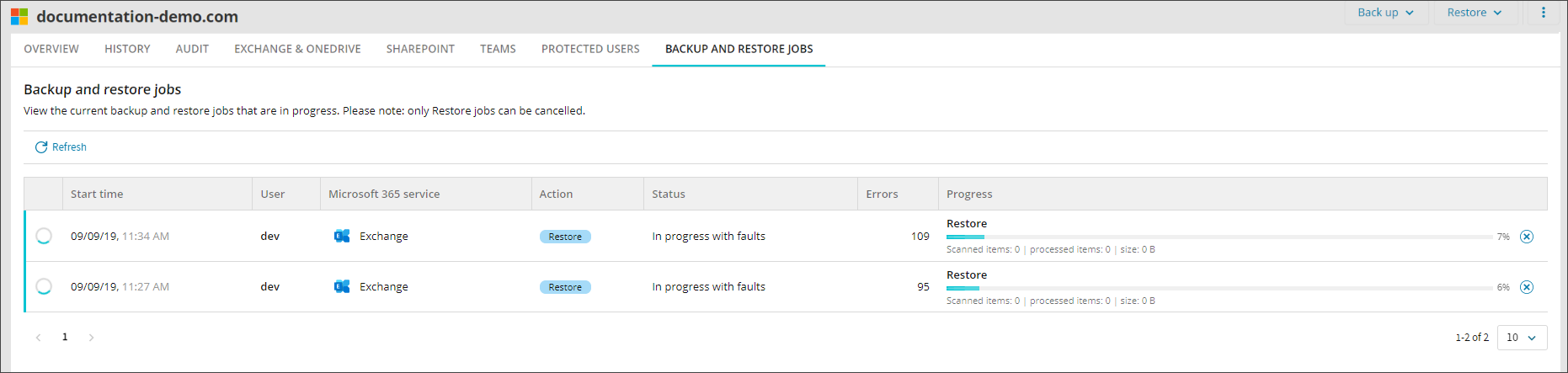 To view the current backup and restore sessions that are in progress, these can be found in the Backup and Restore Jobs tab. The tab itself will also indicate how many jobs are active by showing a badge in the tab header. Beneath the progress bar you can also see the number of scanned items, processed items and size of the backup.