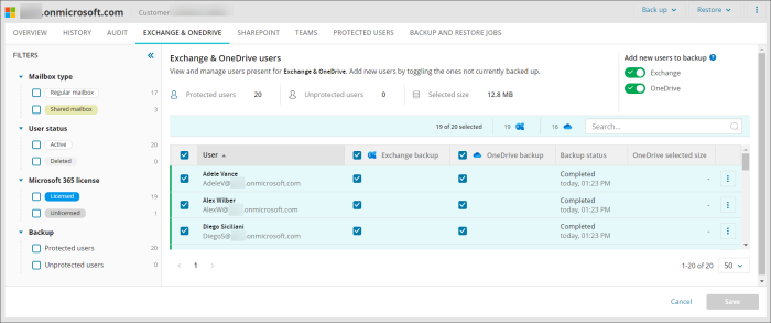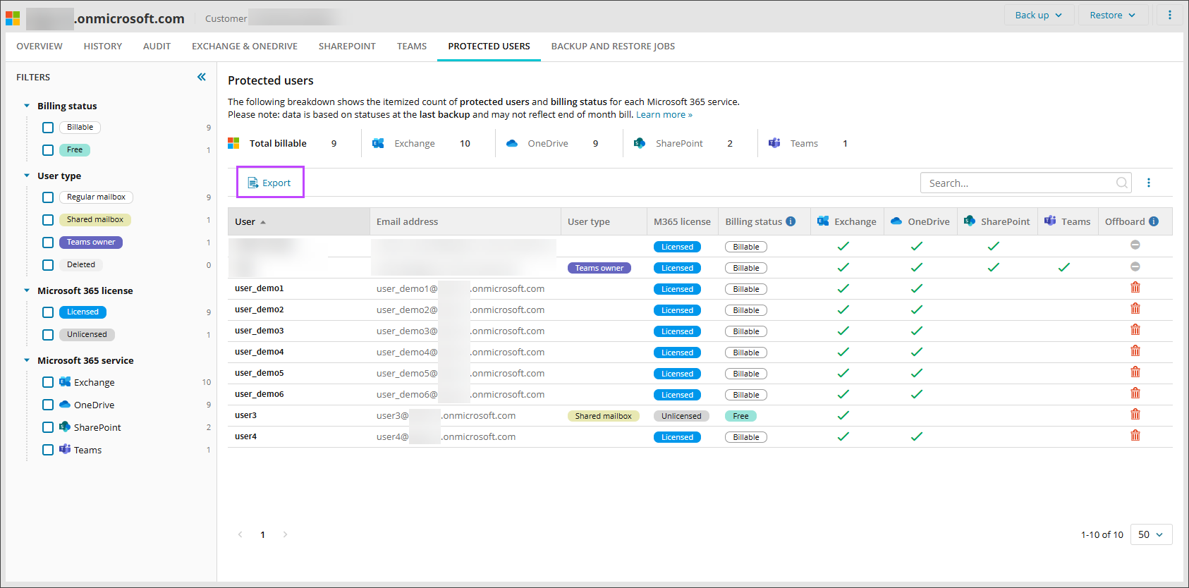 You can filter the displayed list by using the Filters on the left of the display, filtering on the Mailbox Type of Regular mailbox or Shared mailbox, User Status of Active or Deleted, Microsoft 365 license Licensed or Unlicensed and Backup Protected Users or Unprotected users.