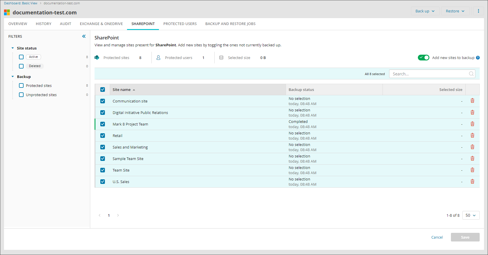 You can filter the displayed list by using the Filters on the left of the display, filtering on the Site Status of Active or Deleted and Backup Protected or Unprotected sites.