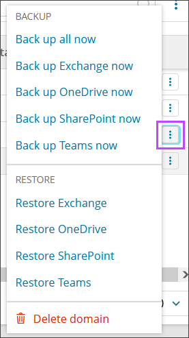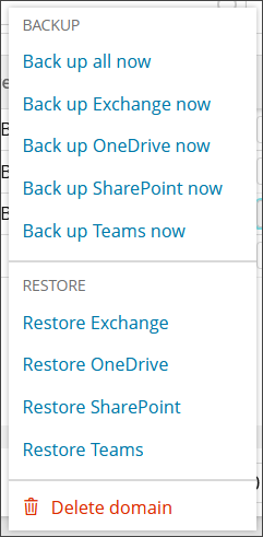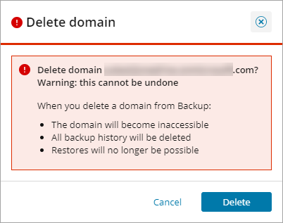 - Delete domain (the domain is deleted from the Console and all its backup data is cleared from the N-able cloud with no possibility of recovery)