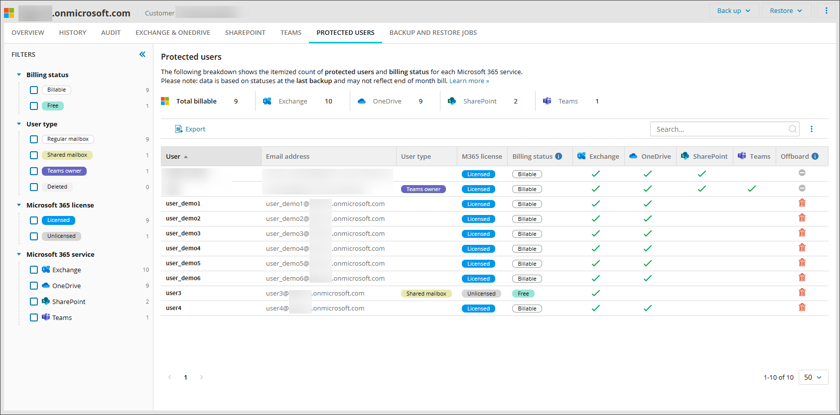 In Cove Data Protection (Cove), billable users are those in Microsoft 365 that have at least one of the following data sources (services) protected: