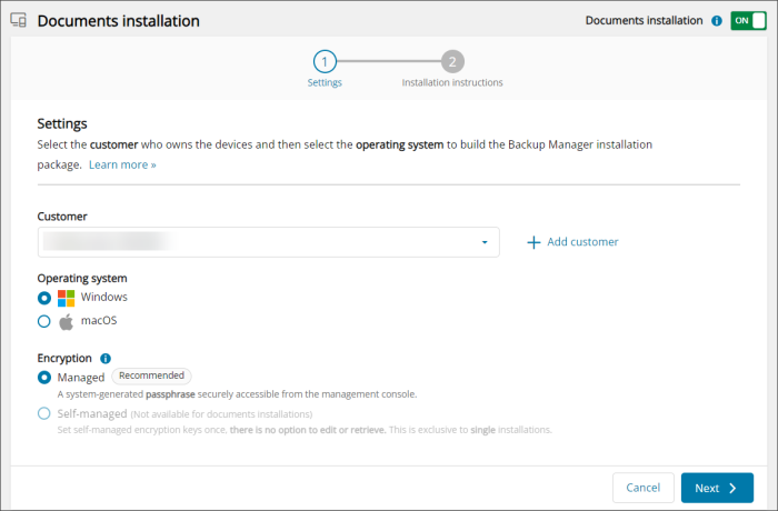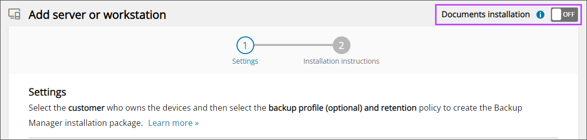 - Using the toggle in the upper right-hand corner of the wizard, switch to Documents Installation