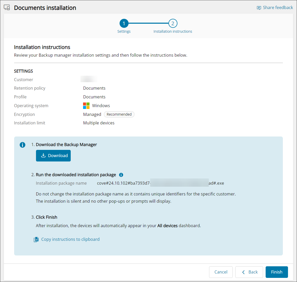 Do not change the installation package name from the one provided on your dialog. This is because the package name is a unique identifier for the specific customer and device and doing so will stop the installation from functioning appropriately.