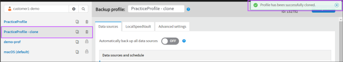 - Once the profile has been successfully copied, a banner will be displayed to advise as such and it will appear in the Profiles list with the profile name in the format of 'ExistingProfileName - clone'