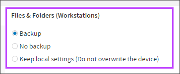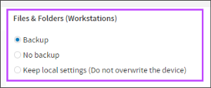 - Keep local settings - this mixed option allows you to retain the locally configured backup selection, but automate the backup schedule
