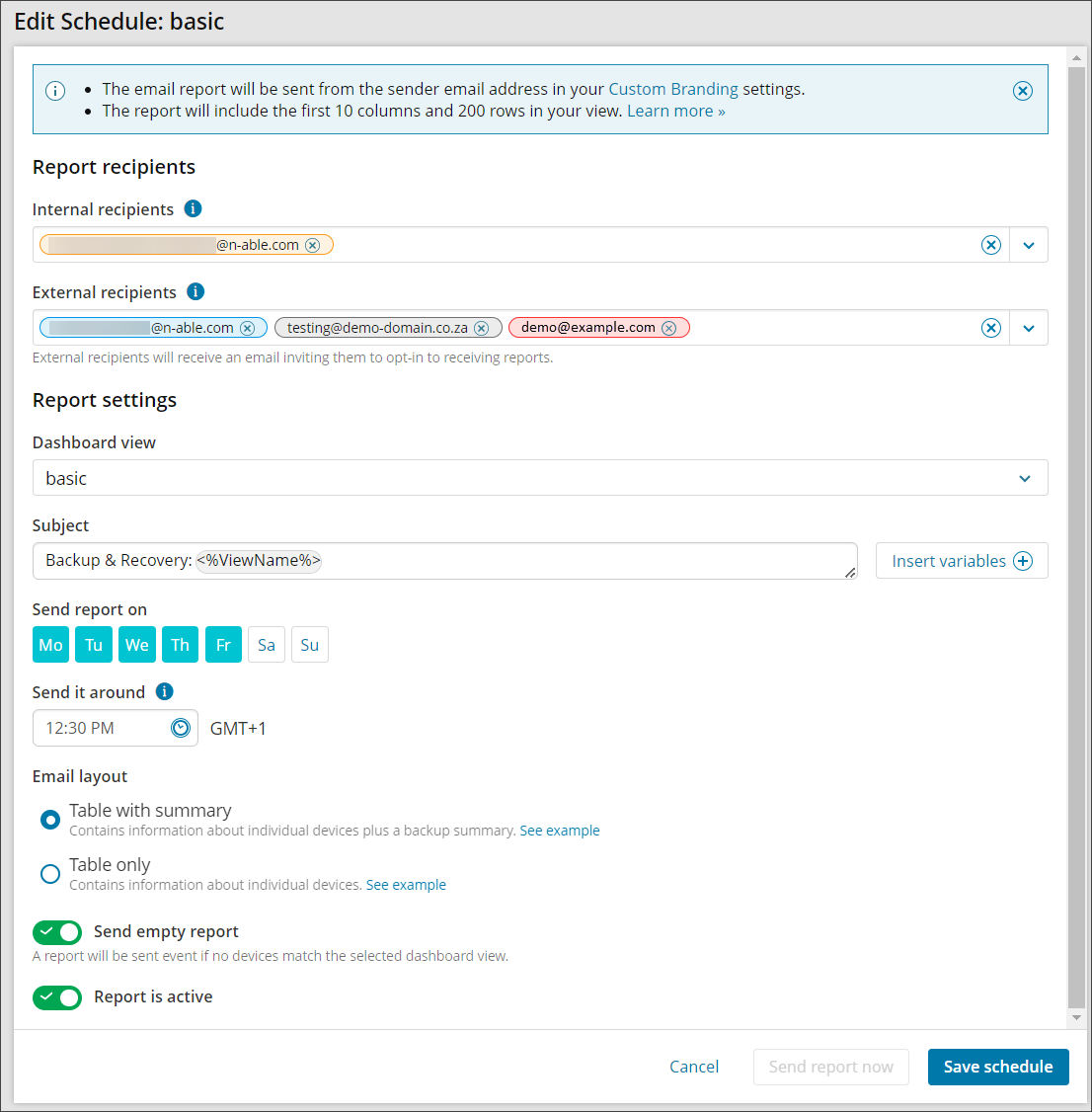 - External recipient(s) - Type single or multiple external email addresses to receive a copy of the report
