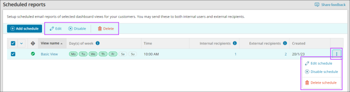 - Open the action menu to the right-hand side of the schedule and click Disable schedule or Enable schedule