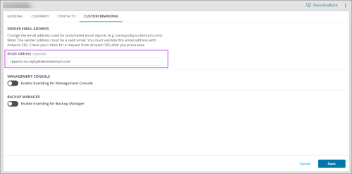 - The From field of all scheduled reports contains the address from your Custom Branding settings (the Edit customer dialogue). If no address is specified there, the address of your parent customer is used