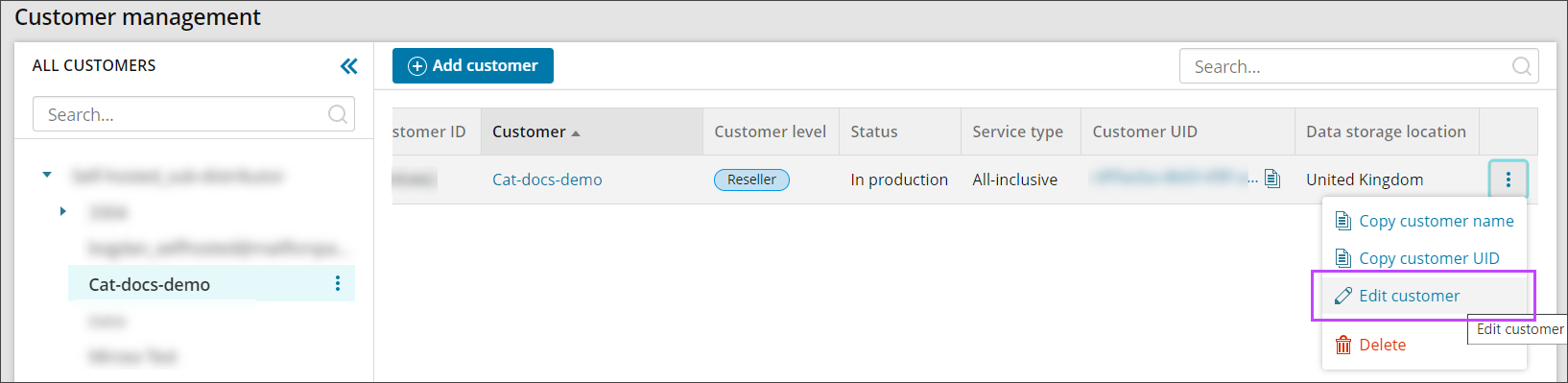 - Scroll to the right of the Customer and click the three vertical dots to open the action menu