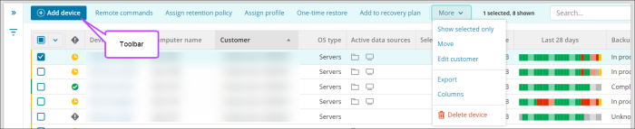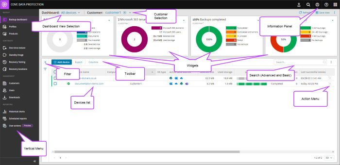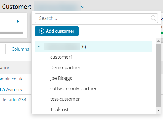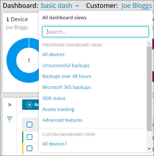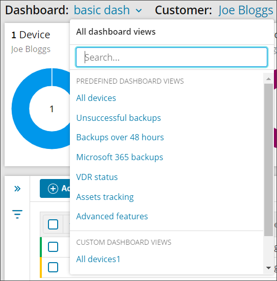 The Customer selection allows you to view the backup devices specific to the selected customer using the dropdown at the top of the page.