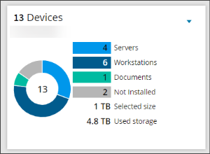 - The Devices widget illustrates the distribution of devices by the type with a choice of Server, Workstation, Documents and Not Installed. The selected size and used storage for these devices is displayed below