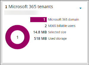 - The Microsoft 365 widget gives a break down of the number of Microsoft 365 domains and billable users. The selected size and used storage are displayed below