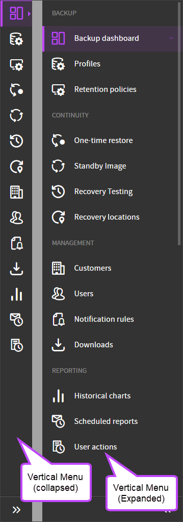 A vertical menu on the left side of the screen lets you navigate from Backup > Dashboard to other modules and back. The menu can be collapsed or expanded using the << or >> arrows as required.