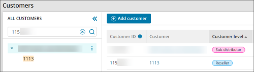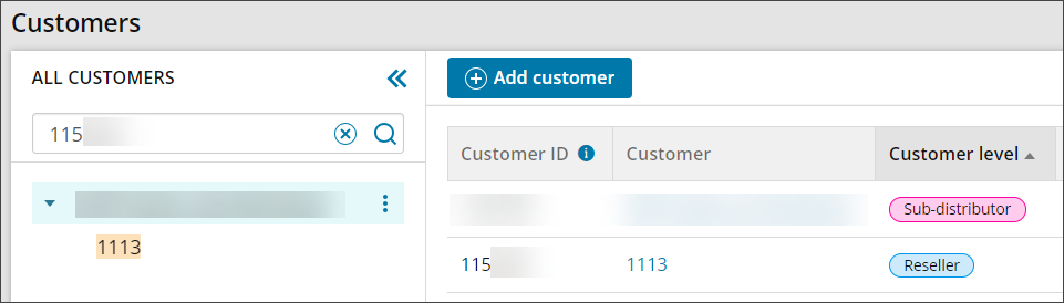 5. The searched for Customer ID will be returned in the both the left-hand search panel and the main customer list to the right-hand side in a tree structure with the parent and any child partners: