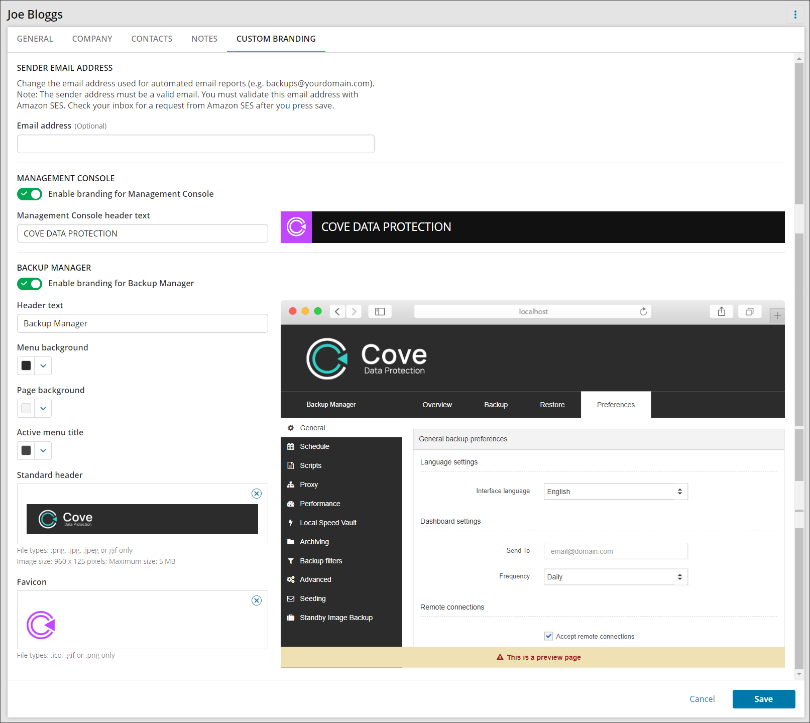 • Management Console header text - this allows you to change the text shown in the header of the Management Console from the default of Cove Data Protection to something different in line with your custom branding