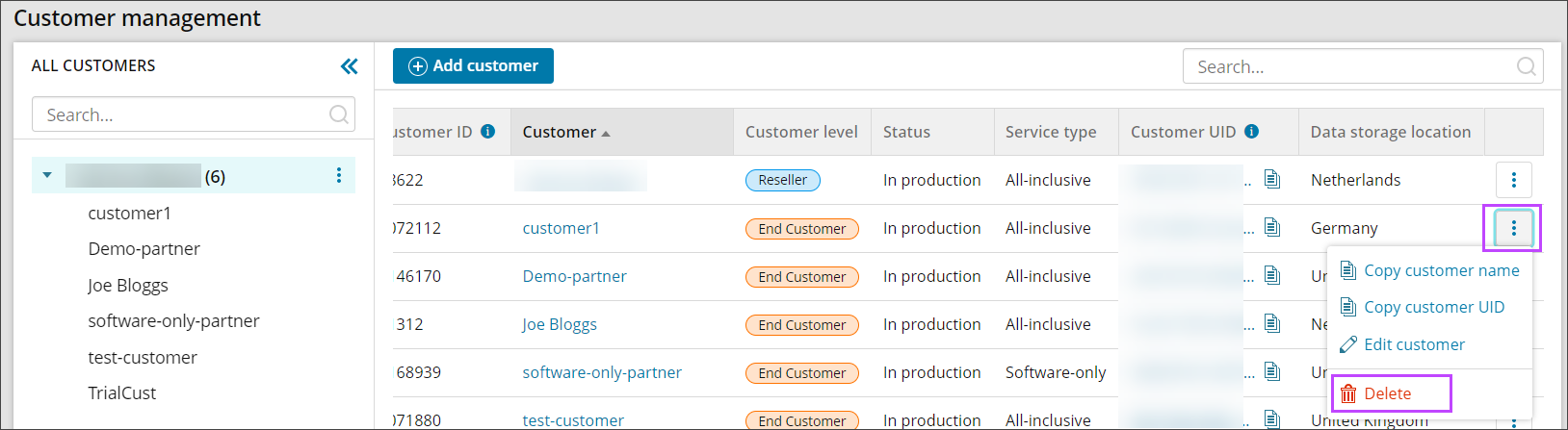 You can remove only those customers that do not have any devices or customers of their own, or with any recovery locations assigned to them. This must be done from the Customer Management window:
