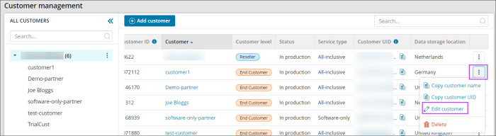 4. Scroll to the right of the Customer and click the three vertical dots to open the action menu