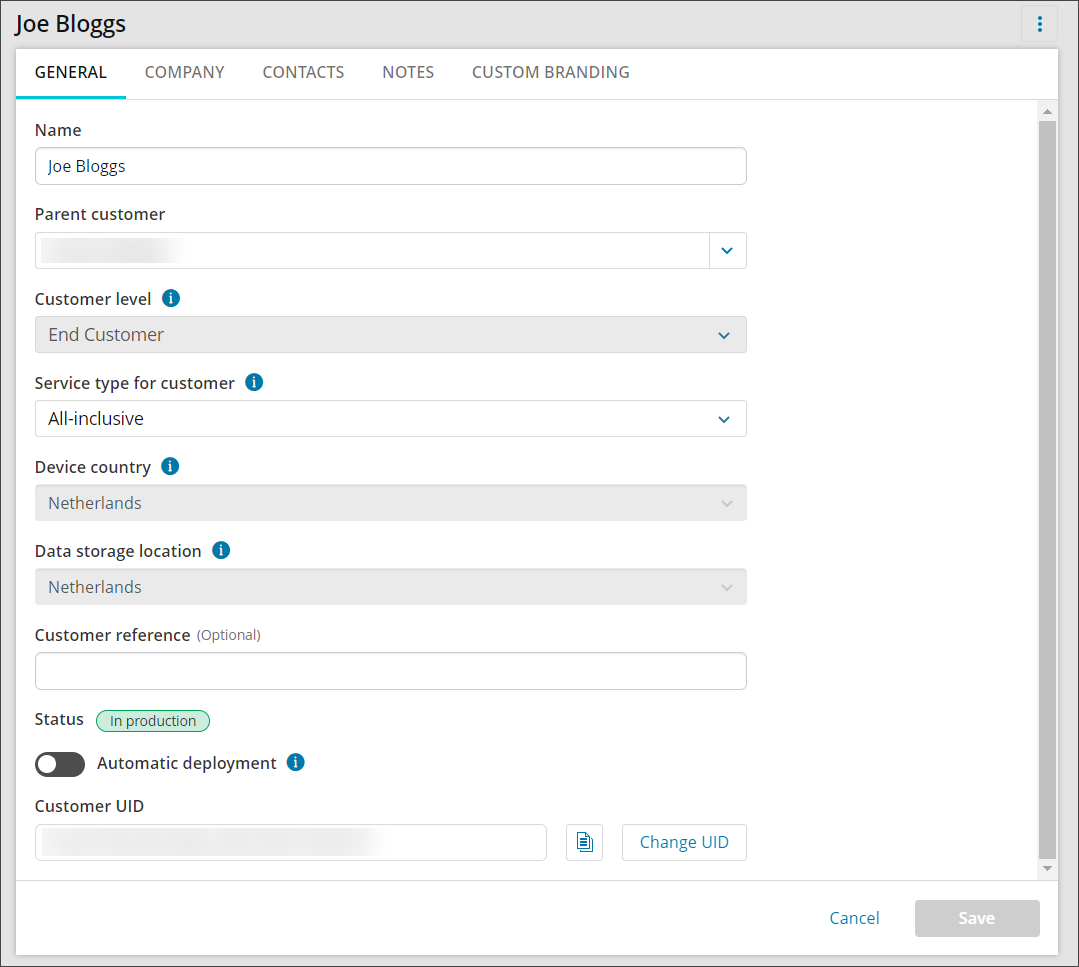 • Name - You may rename the Customer, but please keep in mind that customer names are sometimes required for authorization. So users from the customer company will need to update their access credentials for the Cloud
