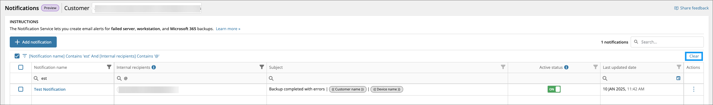 Filters can be cleared by clicking the Clear button at the top of the Notifications page, to the right of the filter string: