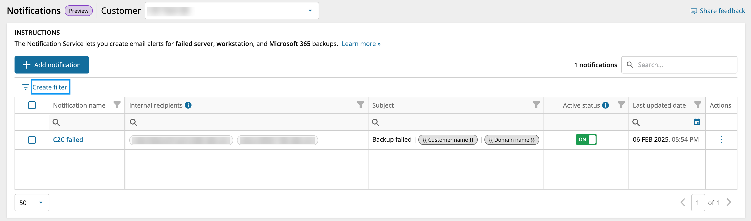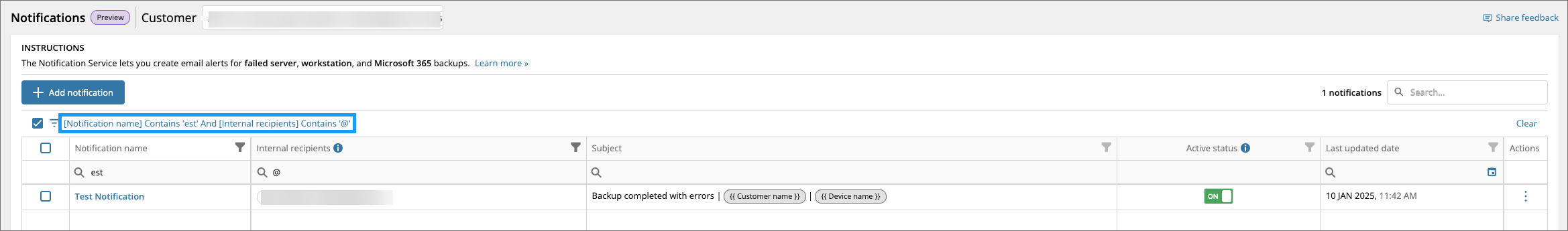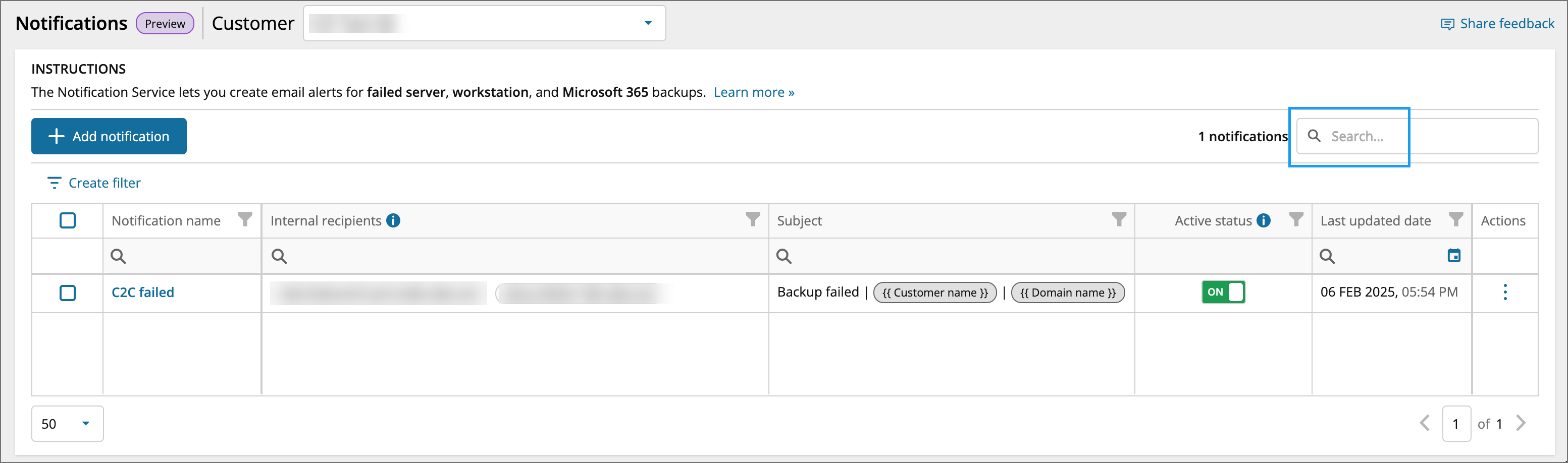 The list of Notifications in Cove Data Protection (Cove)'s Management Console can be searched and filtered accordingly, to fit required criteria.