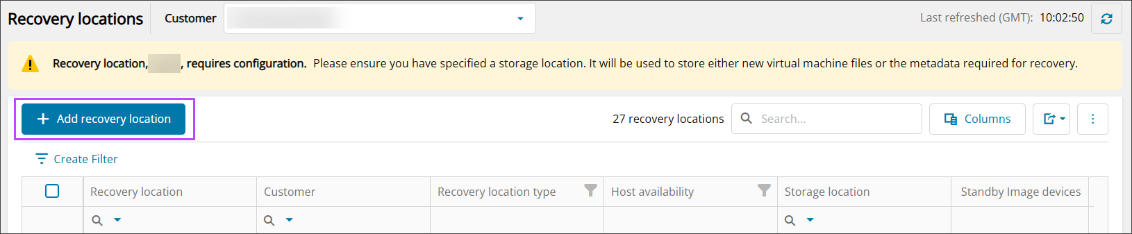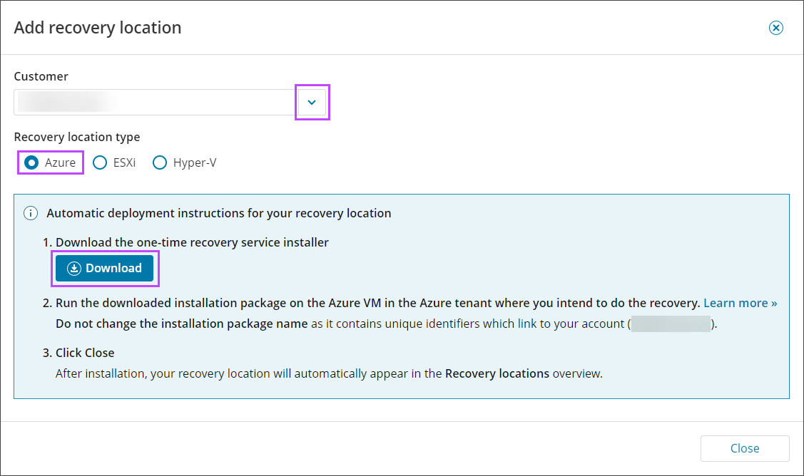 - In the Add Recovery Location wizard, select the customer to attribute the recovery location to, from the dropdown