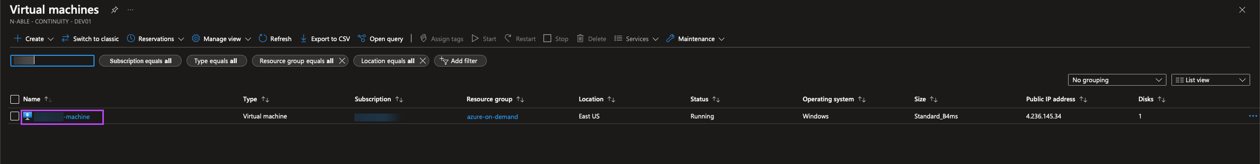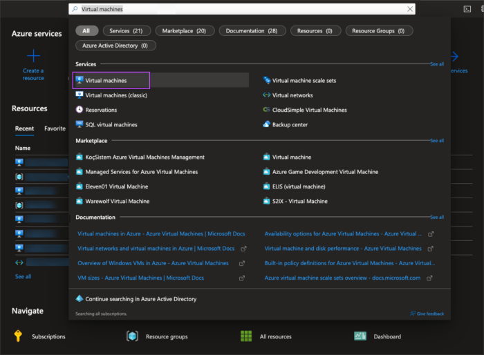 - Using the search bar within the Azure Portal, type Virtual Machines, then select the Virtual Machines service from the results