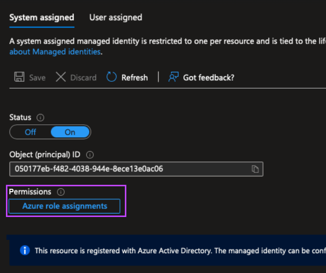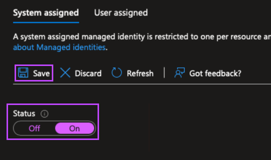 - In the System Assigned tab, set the Status to ON
