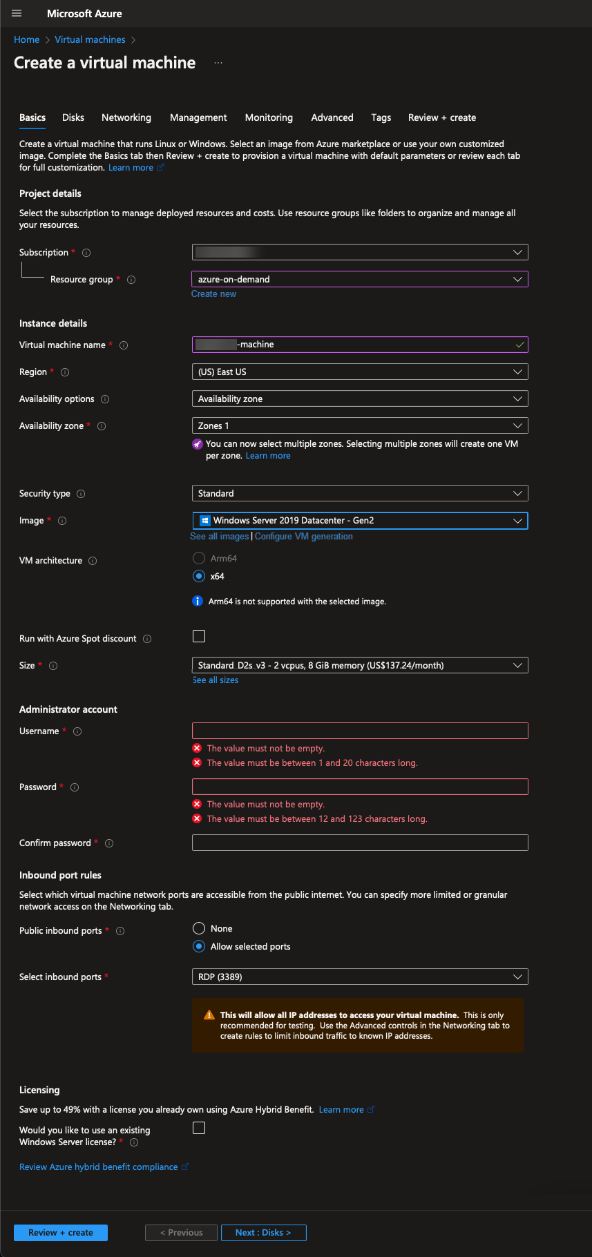 - On the Disks tab, select the OS disk Type of Standard HDD