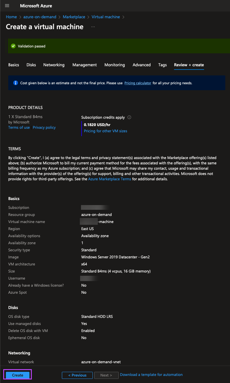 - After a few seconds, the request will be validated. Review the settings and click Create