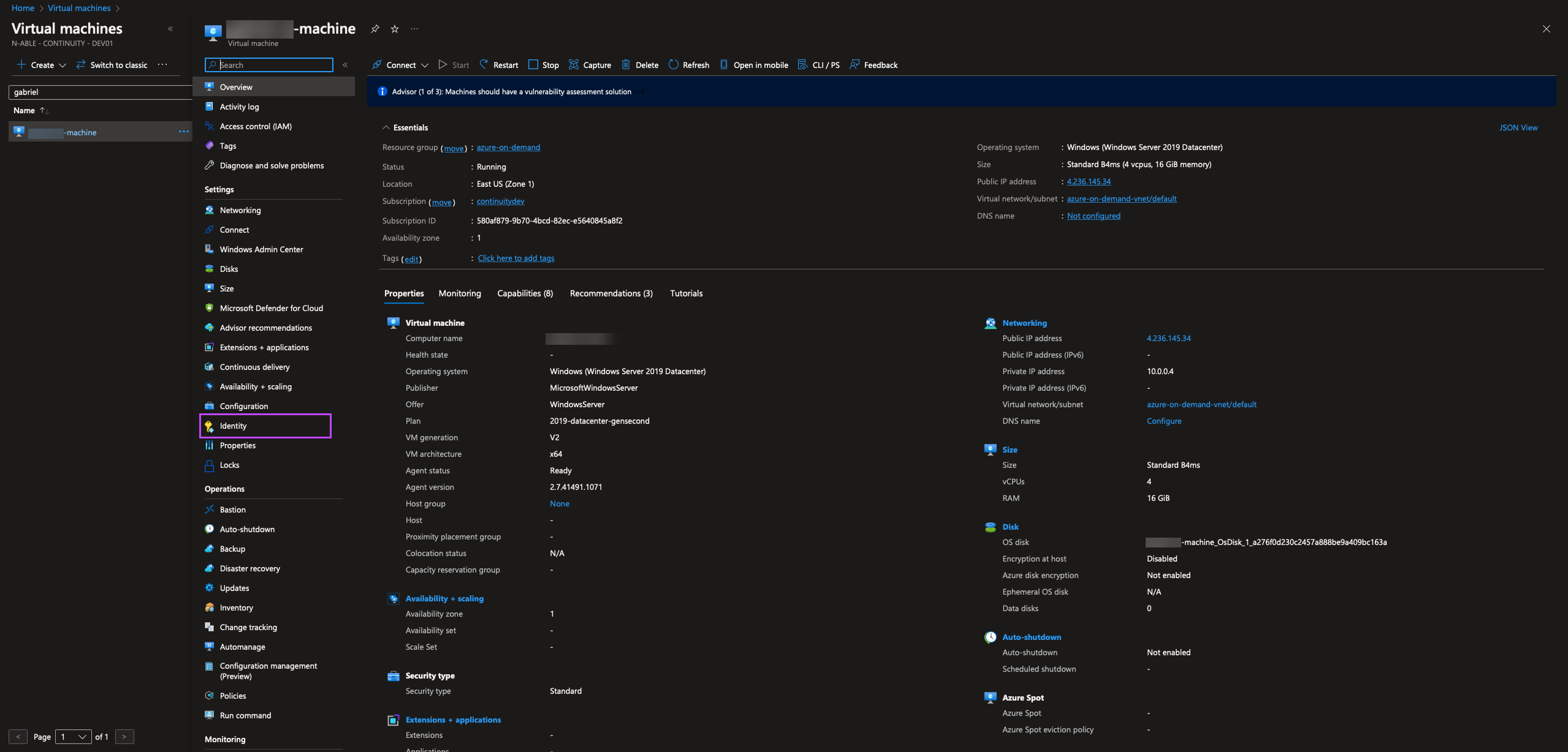 - In the Virtual Machine, click the dropdown by the search bar and click Identity