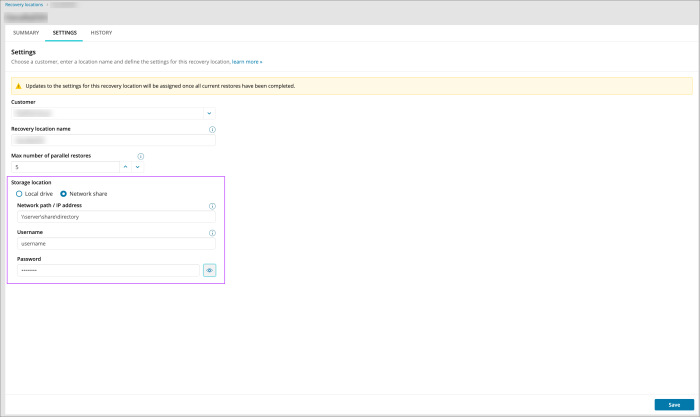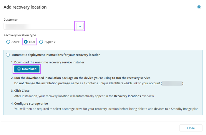 - In the Add Recovery Location wizard, select the customer to attribute the recovery location to from the dropdown