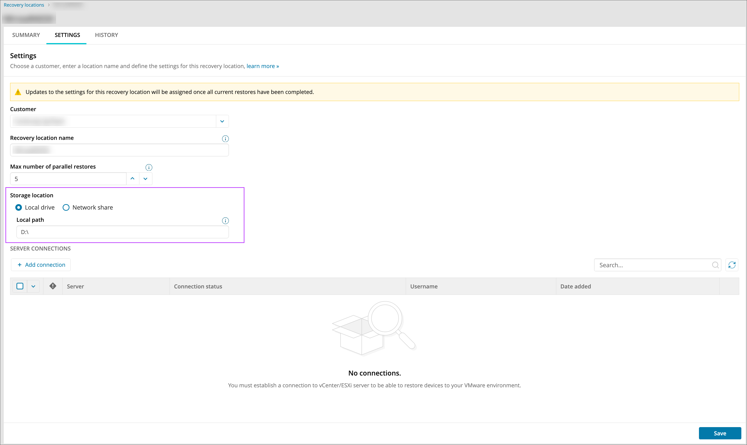 Without a storage location, connections cannot be made to any of the added servers. If you want to restore to Local VMDK is not obligatory to configure server connections. The VMDK file will be restored directly to the storage path, and not on the ESXi server.