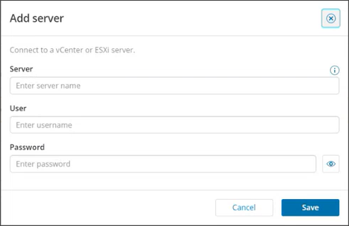 - Enter the vCenter or ESXi server name or IP address, and your username and password for this