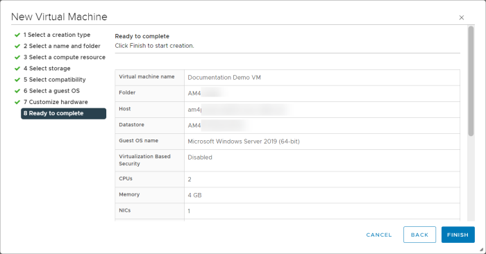 - Confirm the details of the new Virtual Machine and click Finish to begin creation of the new Virtual Machine