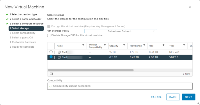 - Select the data store from the available options for the configuration and disk files and click Next