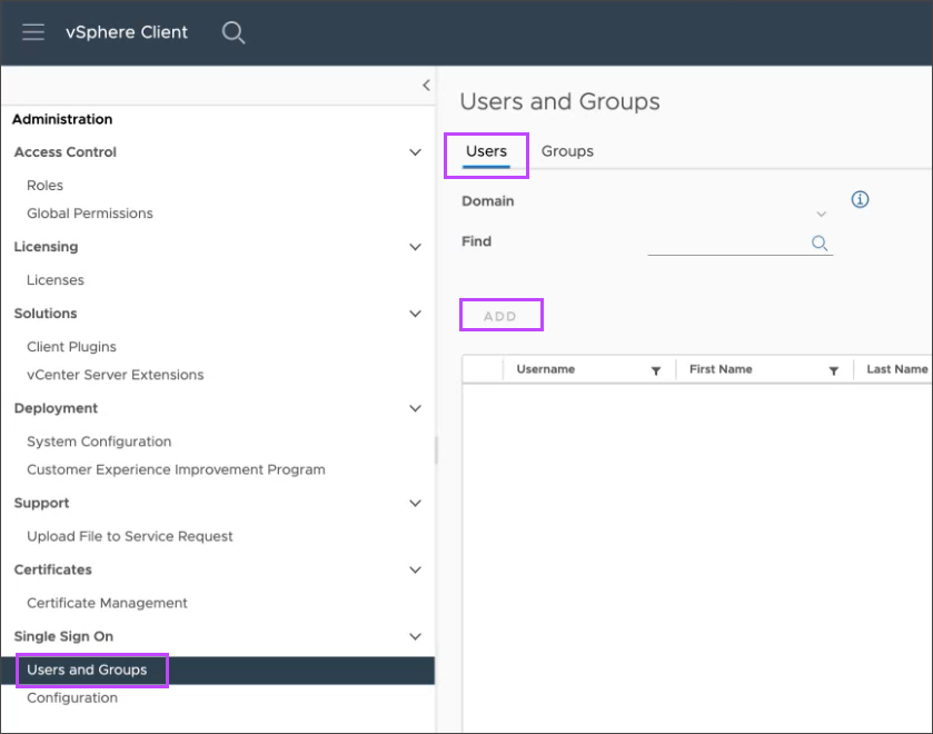 - In the Users and Groups page, select the Users tab and click Add
