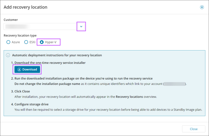 - In the Add Recovery Location wizard, select the customer to attribute the recovery location to, from the dropdown