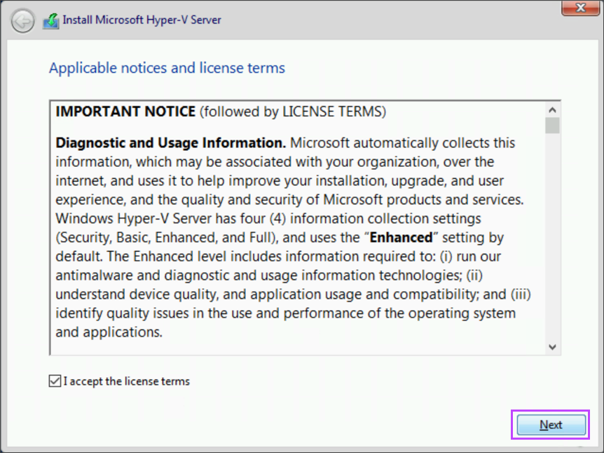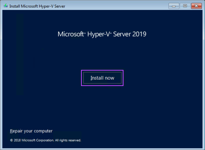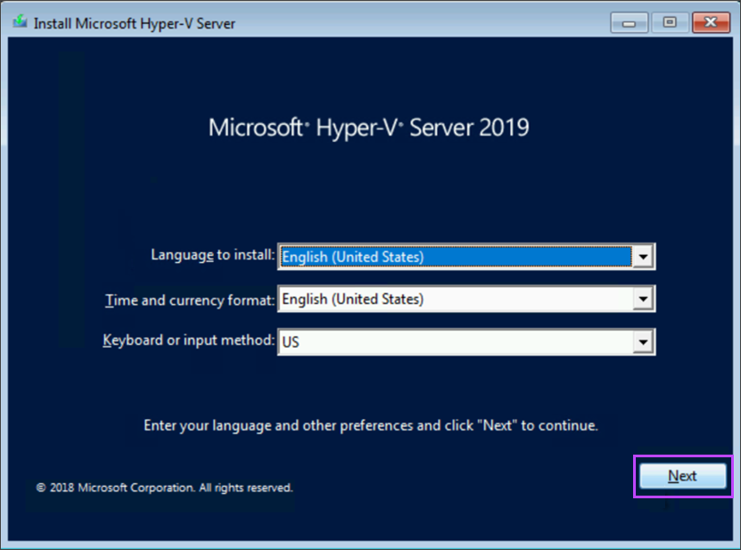 - Begin the installation of Hyper-V Server 2019