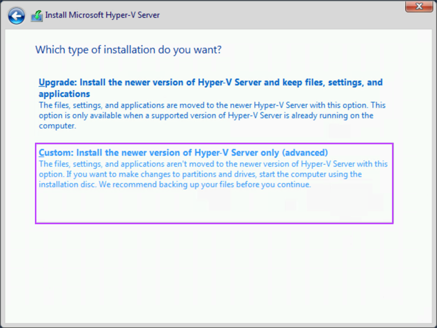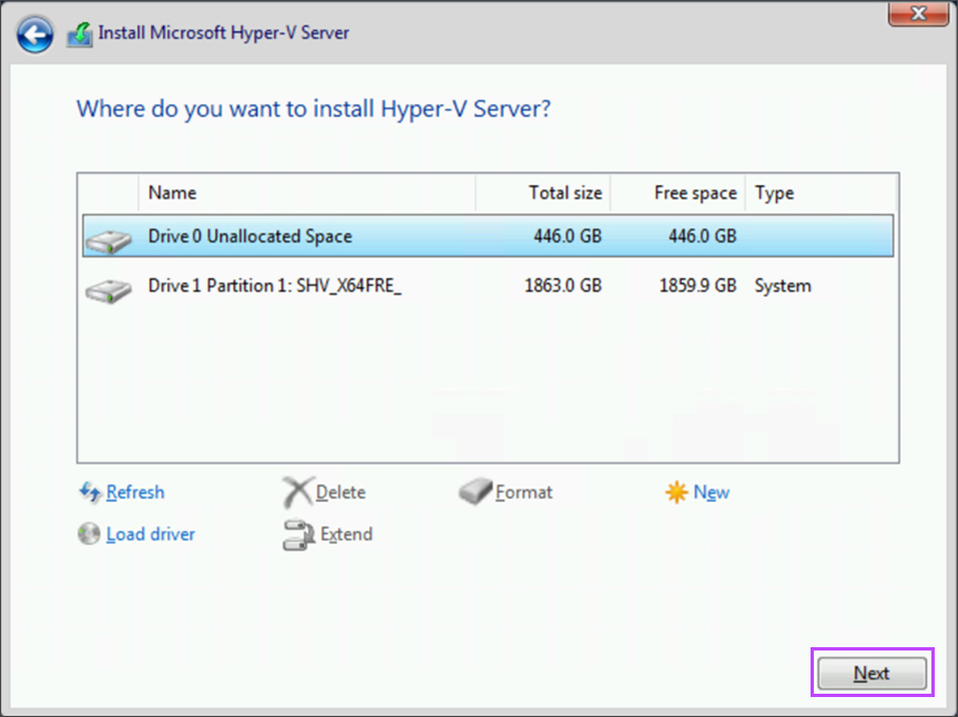 - Select the drive you want top install the Hyper-V Server on