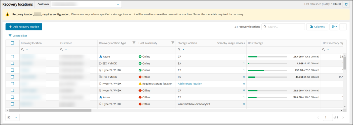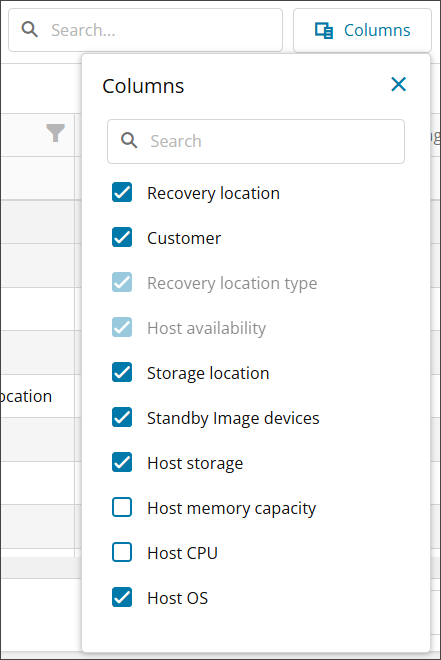 From the Recovery Location page, you can search using the Search bar, or by the Recovery Location name, Customer, Storage Location, Host memory capacity, Host CPU, Host OS, Version, Created date, Created by, Last modified, and Last modified by columns specifically to find locations from the full list that meet your required criteria.