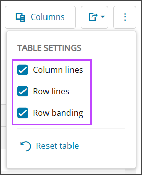 - Column Lines - this will change the visibility of the dividing lines between the columns of the table