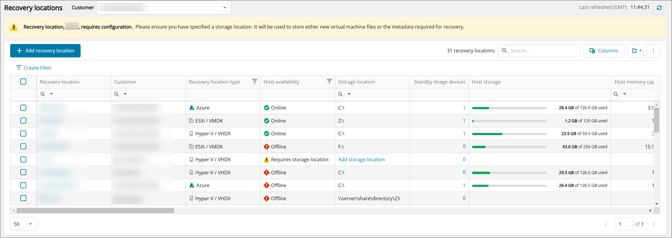 Recovery Locations, the host running the recovery service and processing data restores, can be added, edited, and deleted in the Recovery Locations page of the Management Console. They can be added prior to adding devices to the Standby Image plan, or on the first step of the Enable Standby Image to Hyper-V, Enable Standby Image to Azure and Enable Standby Image to ESXi wizards.